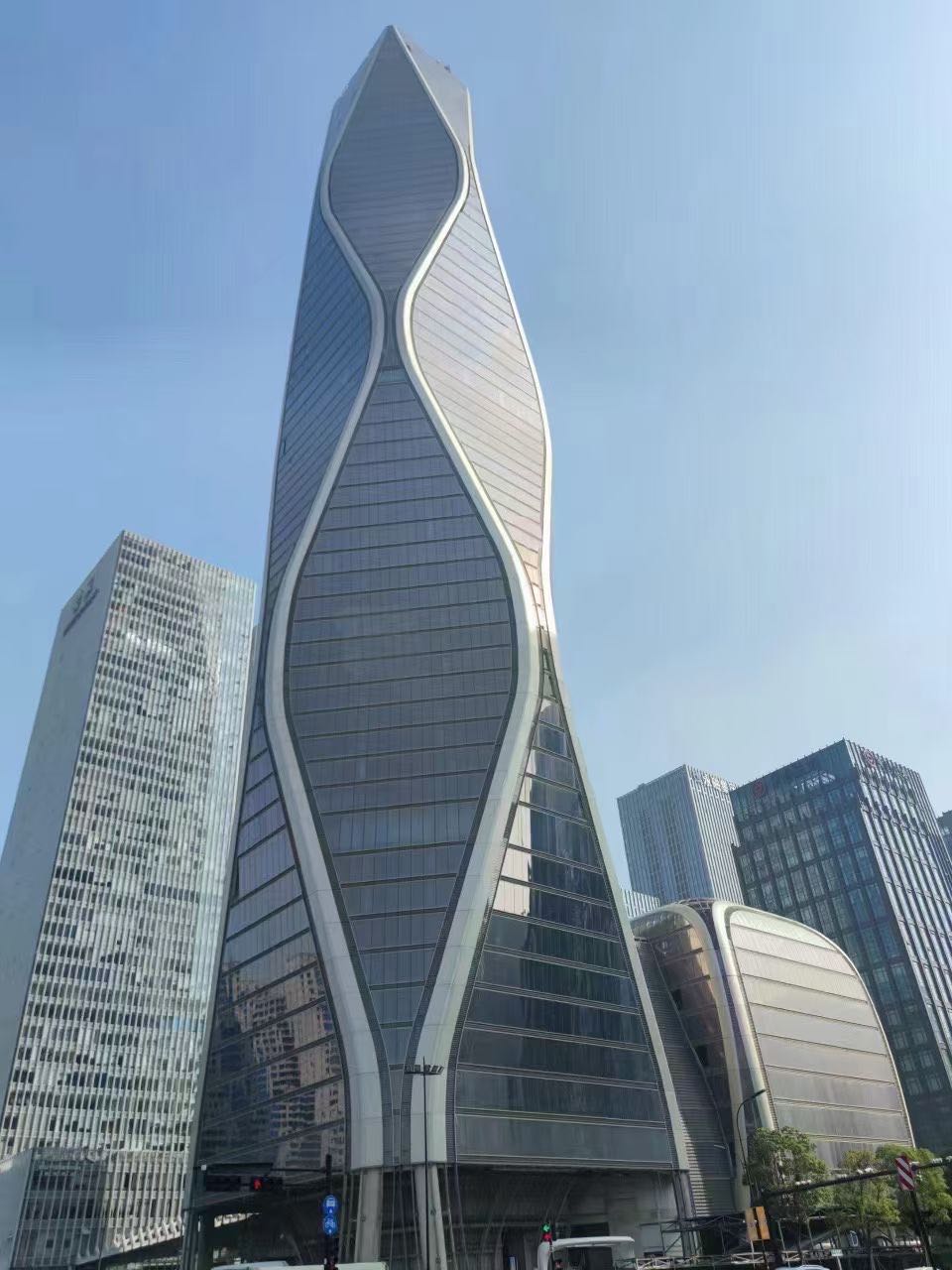 12.5 萬平方米的塔樓,造型獨特,沿著脈動的曲線向著云端升騰,讓人聯(lián)想到錢塘江漣漪的波紋。