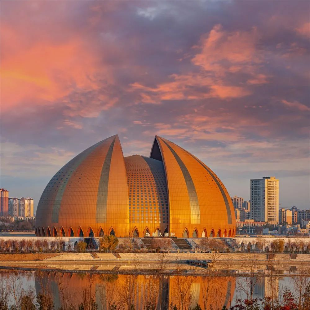 座落于昌吉的新疆大劇院,是中國目前最具民族文化特征的標(biāo)志性建筑,也是印象西域國際文化旅游產(chǎn)業(yè)園的核心建筑。主體坐落在平緩的臺基上,以盛開的天山雪蓮為原型,通過抽象與創(chuàng)新的設(shè)計手法,形成里外套層的穹頂造型主體形象。