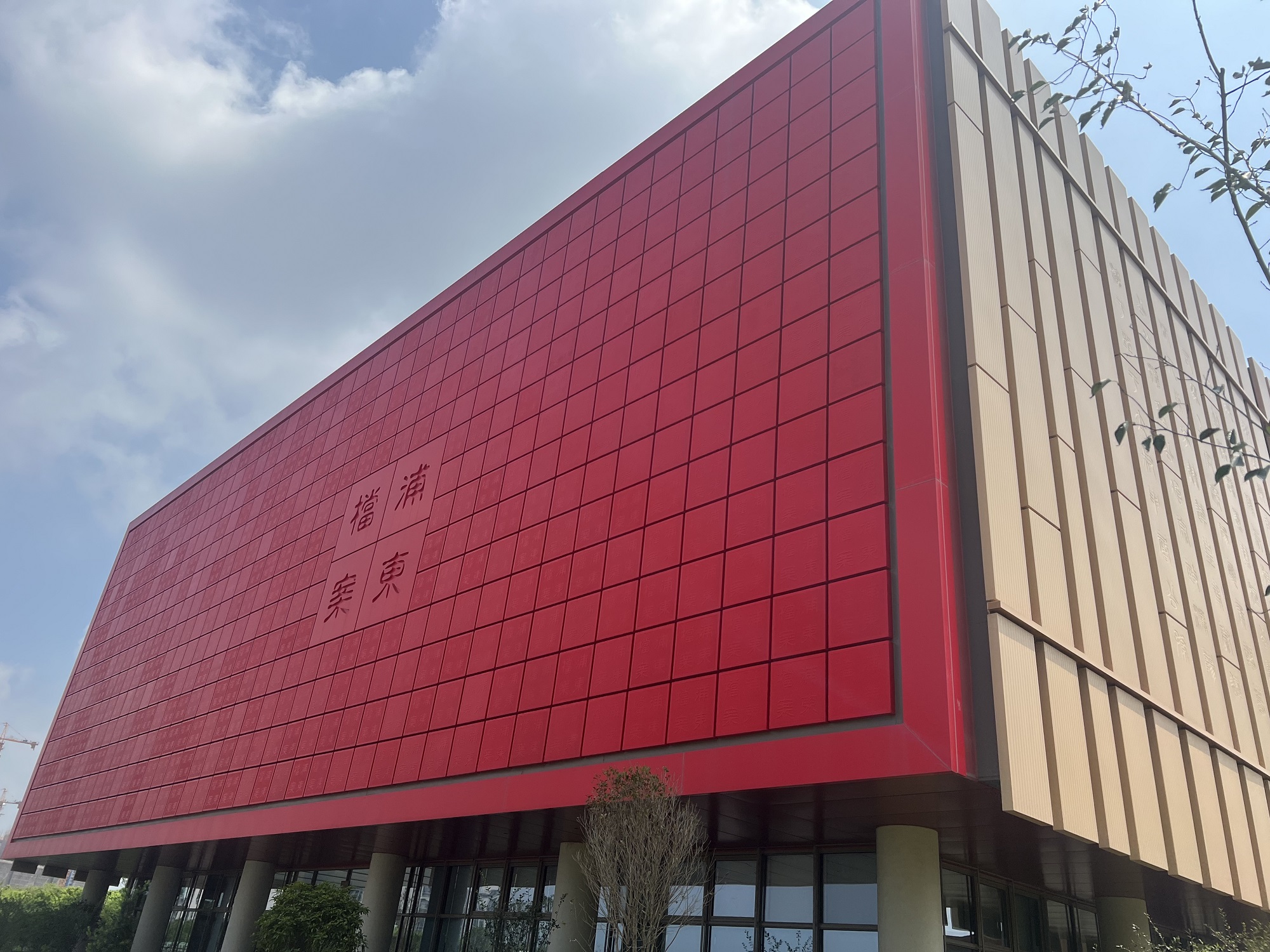 經(jīng)過一遍遍的編程、雕刻、噴涂嘗試,終于在5毫米鋁板上,用滿樘的浮雕工藝,生動展示中國古代印章特征,塑造出風(fēng)化的蝕刻痕跡,將建筑外幕墻紅色印章和原色竹簡生動還原, 更好體現(xiàn)檔案館外觀上的年代感和內(nèi)含海派文化特有的底蘊。
