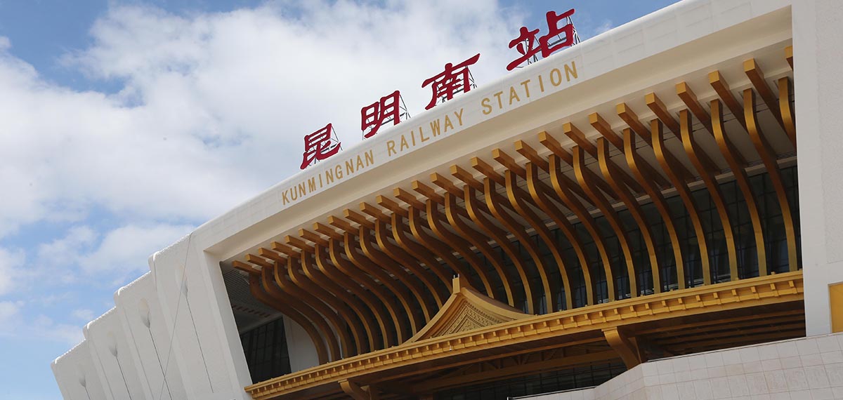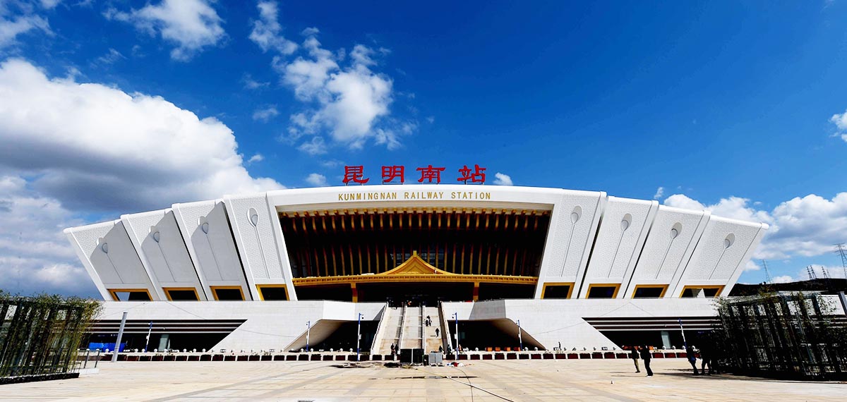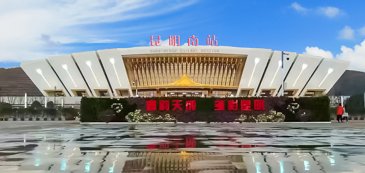 昆明南站(Kunming Nan Railway Station):位于云南省昆明市呈貢區(qū)吳家營街道白龍?zhí)渡侥_之西,坐東向西,東邊是山區(qū),西距昆明市政府大樓約3公里、滇池約7公里,南面是西南聯大舊址和呈貢大學城,北距昆明站約28公里。正面造型為孔雀開屏、鮮花綻放。